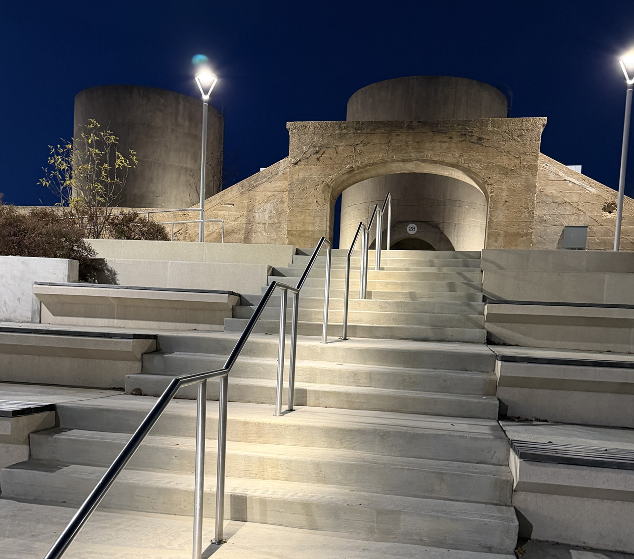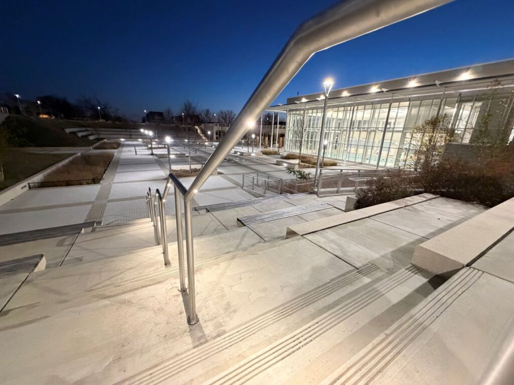 Successful public-space lighting requires close coordination across disciplines. For the McMillan project,Chesapeake worked with the lighting designers, whose team carefully evaluated pedestrian circulation, stair geometry, and nighttime visibility requirements. Landscape architecture was provided by Rhodeside & Harwell, Inc. (Alexandria, VA), whose site design integrates circulation, topography, and lighting into a cohesive user experience. This collaborative approach allowed handrail-integrated lighting to become a seamless part of the site—supporting safety, wayfinding, and architectural clarity without introducing visual clutter.  The McMillan site features long, multi-tiered concrete stairways, ramps, and elevated walkways connecting multiple elevations throughout the park. In environments like this, traditional pole-mounted or wall-mounted fixtures alone often struggle to provide consistent step illumination without creating glare, light pollution or uneven lighting.   For these reasons, LED handrail provides an excellent solution,  by keeping light focused on the apporpriate surfaces.